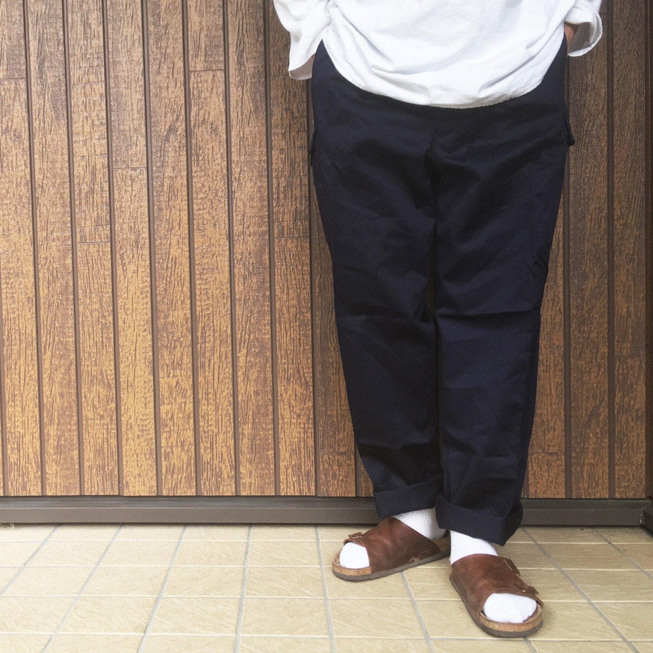 後期と違いコットンサテンのようなやや厚手で鈍い光沢のある茄子色の生地が上品で、既存のカーゴパンツとは違った感覚で着用できます。