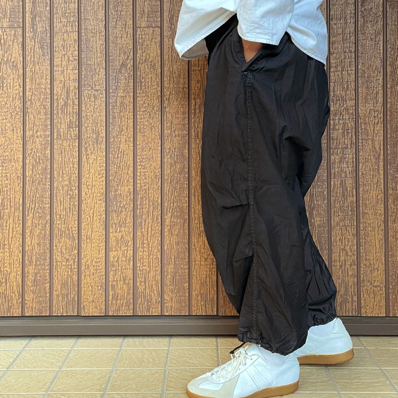 フロントはスナップボタンとファスナーによる開閉、ファスナーはIDEAL社製、バックポケットは右側のみ(バックポケットは機能します)、M65と同様にフロントのフラップと膝周りにアクションプリーツがとられており、ウエストと裾はドローコードにて広さを調整する仕様になっています。